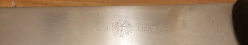 Подписная рукоять. клин не подписан. Длина 30 см. клин 16.5 см. ширина 4.5. см. толщина в обухе 7.65 мм. вес 245 грамм. остаточно острый. Не чистил. не мыл. Нож старой, хорошей работы. Смято монтировочное кольцо (кольцо из нержавейки) отбит самый кончик БК (несколько мм, в пределах половины хамона). Цена 2700 руб. Лот во Владивостоке, где можно посмотреть и забрать, или почта на покупателе.