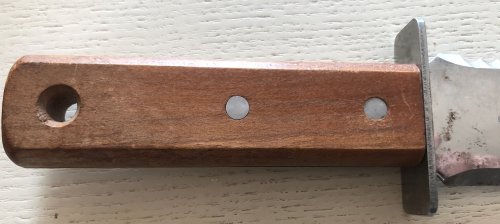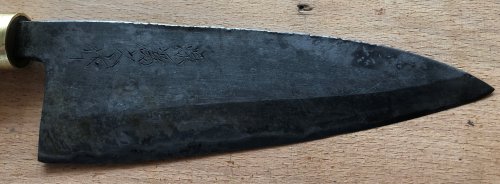 datunbao написал(а):Лот № 4. Япония. Нож Makiri (間切り) или по другому написанию マキリ. Традиционный нож коренного населения - айну. В переводе - красивый нож (другой перевод - нож красивого человека). Общая длина 19 см. Лезвие 8.5 мм, толщина клина 2 мм. ширина 1.75 см. Сковка двух пластин углеродки. Левая голомень ложкообразная, заточка стандартная односторонняя, правая. Клеймен клин . Рукоять покрашена белой масляной краской судя по типажу - под ней выжженная маркировка. Небольшая трещина по рукояти по обуху. Старый автохтонный нож. Не мыл. Не чистил. Не точил. Толковый рабочий нож. Цена - 3000 руб. Лот во Владивостоке. Где можно посмотреть и забрать. Или почта на покупателе.