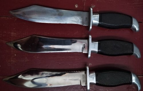 - витиеватые узоры на ноже № 2 и НОПе это буквы ПК (производственный комбинат), это более ранние образцы ножей, до введения логотипа. Позже в таком виде буквы ПК не наносили. На том же более позднем НОПе виден логотип комбината. На других ножах такого рисунка (букв ПК) нет.