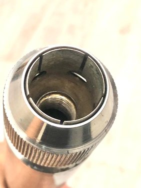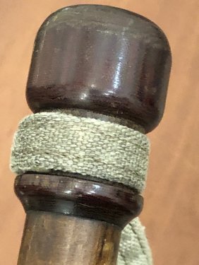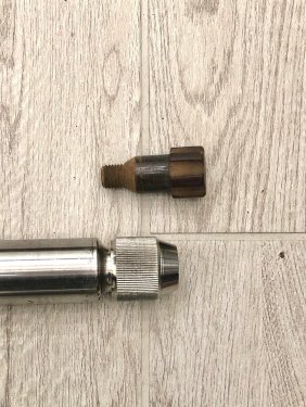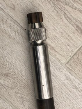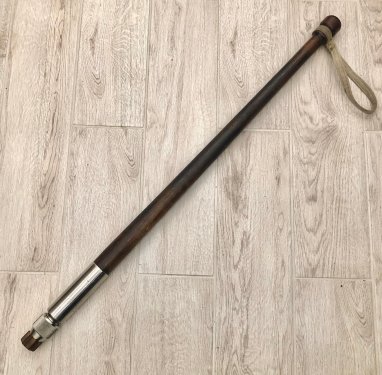 Съемная ударная часть была хозяином утоплена в лунке, после чего долго лежала в кладовке, а после смерти владельца продана его сыном мне. Пешня держалась в древке за счет резьбы и цанги, причем у гайки цанги резьба обратная. Казалось бы, отвалиться никак не могла, но поскольку зимняя рыбалка дело простое - наливай, да пей, то на последней рыбалке ослабевшие руки владельца просто не смогли ввинтить пешню и ограничились цангой, ну и все... Полагаю, что заводская самоделка, вряд ли серийка. Очень затейливая конструкция, даже головка деревянного древка, где крепится темляк, сделана из текстолита.