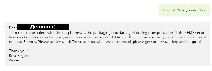 В: Нет никаких проблем с наушниками! Упаковочная коробка пострадала при транспортировке? Инспекция безопасности из e-EMS очень строга и поэтому проводила проверку целых 3 раза!!! Пожалуйста поймите! Мы никак не можем повлиять на это! Пожалуйста поймите и поддержите нас! (Здесь меня начало эйфорить! Всего с одного сообщения он полностью утопил себя! Шах и мат!)