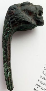 Сперва полагали, что это обломыш скифомеотского псалия века 5 до н. э. по фото, но живьём оказался очень массивен 107гр и абс не приплюснут как обычнр псалии. Тогда как гипотеза возникла идея, что ручка от патерра или вазы (римская или скорее восточного происхождения какая то судя по стилю исполнения морды пантеры) . одно из фото это моя попытка с позволения сказать реконструкции, но с чашей позднего времени и явно не подходящего типа. но у Еггерса такого типа ручек не круглого сечения, а прямоугольного я не нашел . Но что бы это могло еще быть уже и нет идей? навершие ритуальное или тыльник и задник рукояти на клинковом оружии, или??? еще Фото площадки с обломком ручки схожего сечением прилагаю он явно ЧК. Стиль морды явно не скифский с восточными нотками более явными, чем наследовались в изображениях от древнего востока меотами, скифами, сарматами и еже с ним. Но это уже чисто мои эстетические домыслы... Жду любых версий и идей от авангарда до очевидностей, но сам уже иссяк в поисках. На Вас лишь надежда.