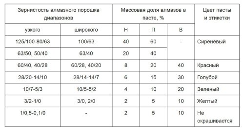 На фото таблица с обозначениями, буквы Н-П-В (Нормальная, Повышенная, Высокое) содержание алмаза. О-смывается органическими растворителями, т.е. на масленой основе. М-мазеобразная, Г- густая. В тюбиках ПОМГ алмазной крошки в два с половиной раза больше чем в НОМГ.