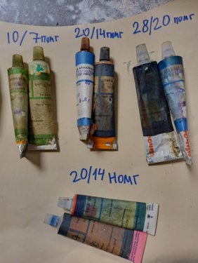 Тюбики встречаются с промасленной этикеткой или без этикетки. Размер зерна например 1\0 отчеканено на корешке тюбика (дополнительно помечаю маркером).