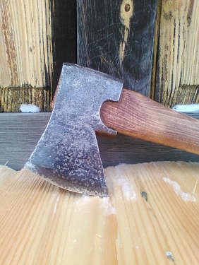 Ivanov написал(а):Добрый день. Почистил вот такой карельский топор. До блеска металла не хочу, осталась тонкая тёмная корочка, по мне в работу сгодится. Воронить все равно не чем, а краска при пользовании все равно местами сходит. Да и уточен он мама не горюй, поэтому на стену не повешаешь. А так очень хороший, видно, что хозяин любил этот топор и бережно относился. Брал, как бильнас, а оказался марифорс. Вышло клеймо MB и надпись mariefors bruk. А ещё на лопасти буквы VK. Это, по видимому, сам владелец выбил. Всад ровнейший! Размеры на фото, вес 1500. То, что это девятка ясно, а вот какая?