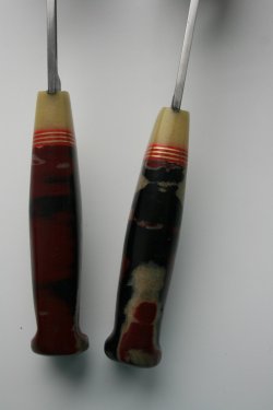 Твердость 60 по HRC .Рукоять желтый стеклотекстолит , фибра , латунь , самодельная микарта .