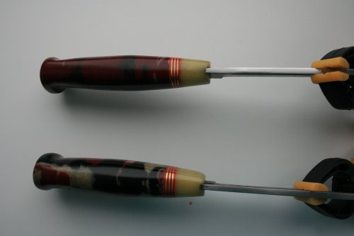 Монтаж рукояти на шпильку в виде трубки белого металла , принцип намотки пропитанных эпоксидной смолой лент материи.