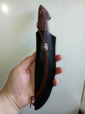 Отверстие для темляка. Спуски прямые не от обуха,фальш лезвие сведение 0, 2 мм. Больстер дюраль, с внутренней стороны битый камень. Слесарка моя. Монтаж всадной. Ножны свободный подвес, натуральная кожа. Твердость по Роквеллу 59 ЕД. 2200 руб