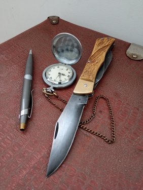 Есть разобранный советский двухпредметник. Основной клинок сломан, а открывашка для консервов и бутылок целая. Пружины тоже в норме. Вполне возможно на нем потренироваться перед сборкой более сложного охотника и сделать на его основе джентельменский. А именно: