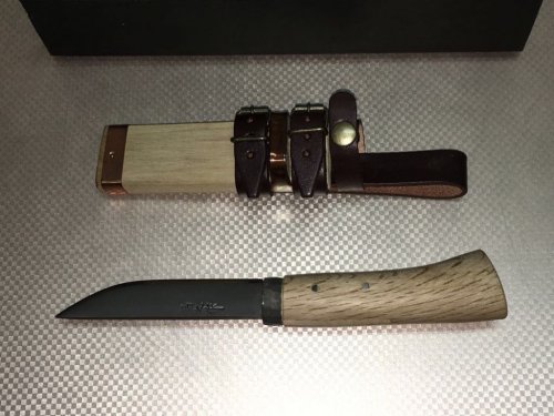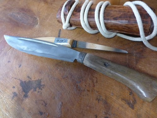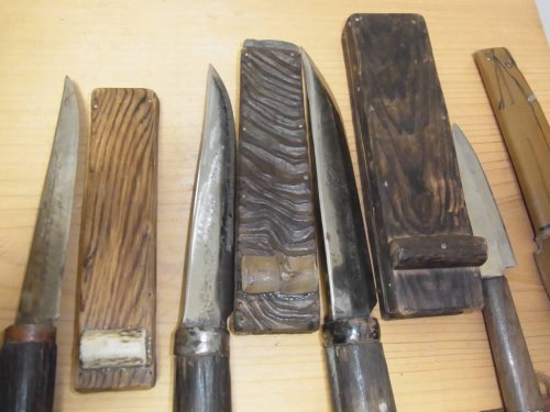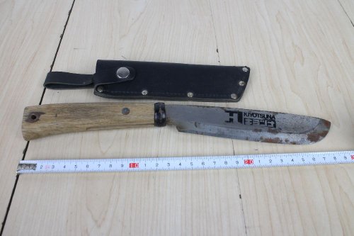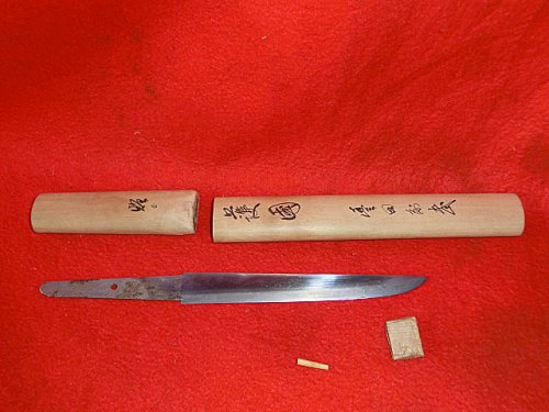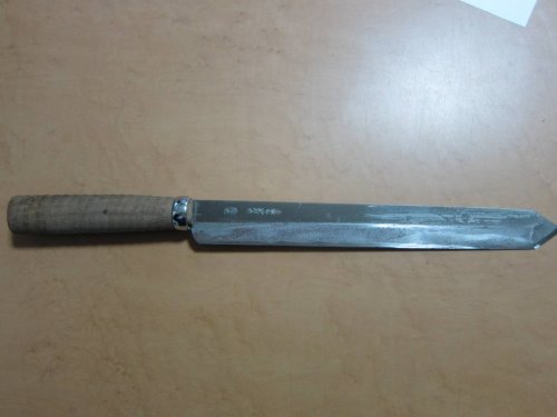 Очевидно до очень исторического близкого времени Япония была страной крестьян. Можно найти достаточно близкие цифры. До 90 % крестьяне. и из них такое же число обрабатывало участок площадью меньше одного гектара. Беспросветная нищета. Отсюда простота быта в том числе ножей. Очевидно основным ножом крестьянина как орудие труда был то что сейчас называют "уличный нож". В реальном обороте таких ножей практически нет. Главное - они имеют лезвие длиннее законных 15 см, а в культурно-историческом качестве очевидно просто не интересны японцам. В свое время можно было их купить, но мне было интересны только ножны, несколько раз фотографировал, несколько фоток сохранилось. Реально в руках есть один, очевидно не слишком старый. Общая длина 32 см. лезвие 22 см. Достался в весьма плачевном виде, с расколотой рукоятью. Почистил, склеил. Японцы очень любят показать, "раскрыть" структуру дерева. Рукоять и ножны сделаны из диморфанта. ( Редкое, реликтовое листопадное дерево, третичного периода, семейства Аралиевые.) У нас краснокнижное дерево, внешне как огромный дуб с кленовыми листьями, еще и с колючками.