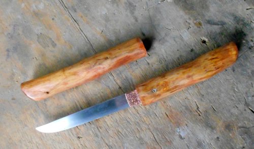 А ведь до этого хотел сделать ещё одно перо. Почти всё сделал и решил попробовать сделать всечку медной проволокой. Прорезал перо (а это Р6М5) насквозь при помощи дреммеля, затем когда уже начал вставлять проволоку медную, тихонько постукивая молоточком и вдруг на самом интересном месте щелчок и..... всё! Вот поэтому в тот же день я сделал клинок для этого кайкэна. Ну и дня два ушло на одевание.