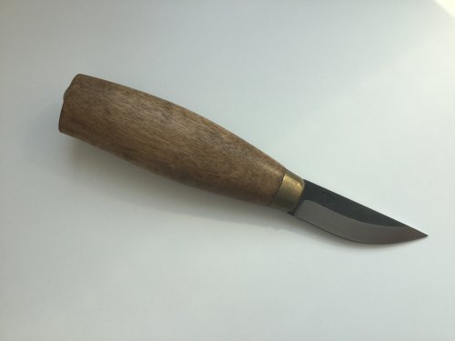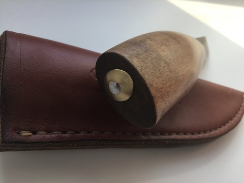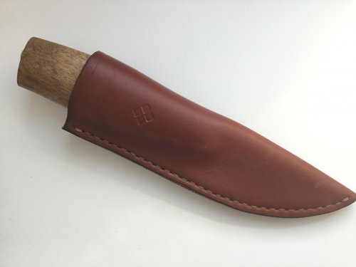 Клиночек Polar 60 mm, нашёлся в старых запасах. Рукоять - простая берёзка, тонированная и пропитанная, очень люблю этот материал и результат, который можно получить. Специально старю, чтобы не было вида нового ножа, так меньше жалеешь при использовании. С ножнами засада - кожа кончилась, совсем, слепил чехол из каких-то обрезков. В общем, не судите строго.