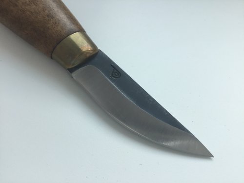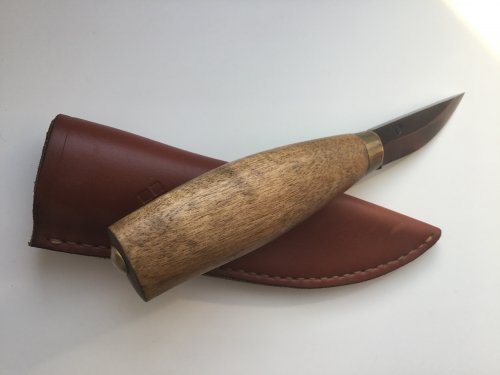 Клиночек Polar 60 mm, нашёлся в старых запасах. Рукоять - простая берёзка, тонированная и пропитанная, очень люблю этот материал и результат, который можно получить. Специально старю, чтобы не было вида нового ножа, так меньше жалеешь при использовании. С ножнами засада - кожа кончилась, совсем, слепил чехол из каких-то обрезков. В общем, не судите строго.