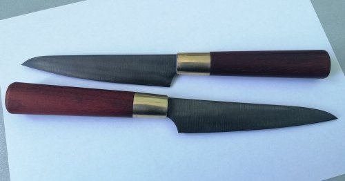 Я отрезал кусок, нужный по длине, положил прямо на горелку большую с двойным пламенем на 45 минут, хотя нужно на час.. При выключеном свете в потёмках цвет металла был тёмно бордовым - как раз примерно 650 градусов. Клинки стали более гибкие, сведение можно делать 0.1 мм. Забыл сфоткать процесс и цвет. Длинную полосу можно прогреть часть и сместить, хвостовик у отверстия не закален примерно на 5 см.чабан написал(а):Добрый день. А как отпуск на газу сделать у меня есть несколько пил подобных? Хочу тоже из них сделать.