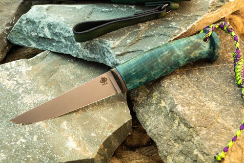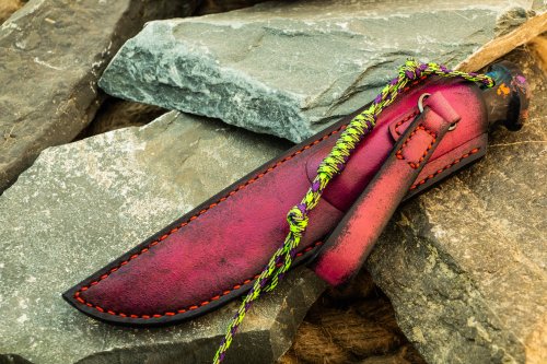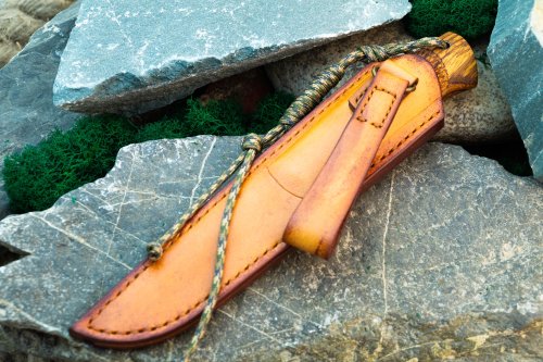 Ножны - удачно-традиционные. И тут стоит поискать свою "изюминку", причем хорошо бы до уровня патентоспособности. Навскидку предложу не прошивать ножны донизу, оставляя отверстие шириной в треть клинка для выпадания из ножен лесного сора, который туда обязательно попадет, пока ножом работаешь.