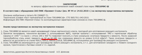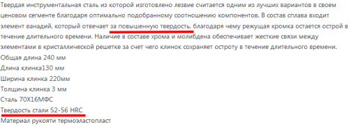 Не знаю, куда ещё вот это... Попалось. Удивился. "Повышенная твёрдость" - это точно 52-56 HRC? Потом вспомнил, что когда-то очень давно уже интересовался "Мелитой", но проржался и отказался иметь с ней дело именно поэтому: То есть ножевая фирма сознательно клепает недокал? Уж простите за "калом бур" (ц) Ржевский. ПыСы. Всё сказанное - сугубо моё мнение, могу быть с ним не согласен. Скрытый текст Ежели убедят.