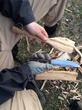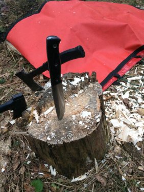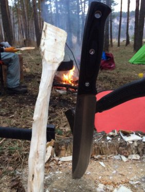 Parovoz написал(а):Потестил на сплаве в Башкирии по Аю спарку Хм и ХL, ножи огнь. Режут, колют, рубят, кайф доставляют, сделал лопаточку для помешивания жратвы в котле, заготовил жерди для походной бани. Спарка полностью перекрывает все походные потребности. Ножны держат надежно, заточка не пострадала за 4 дня поюза, из минусов щель между плашкой и клинком, устранилась развальцовкой трубки с предварительной заливкой эпоксидки.