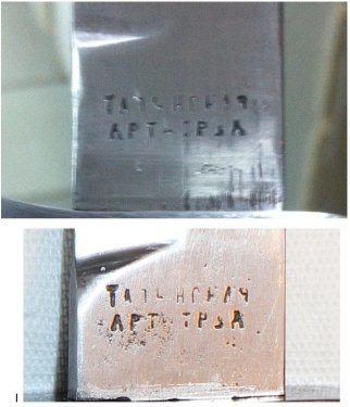 Пока же меня настораживает в клейме то, что между "АРТ" и "Труд" у Вас стоит тире, а этого тире там не должно быть, должна быть точка. Но если копировали с клейма, которое привел коллега Uwin, то тогда все правильно: на нем выбоина, которую можно принять за тире, так прямо и скопировали.