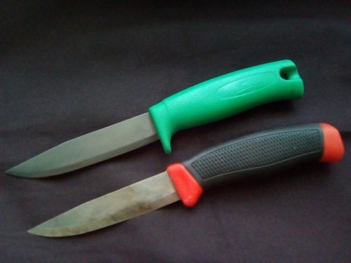 Продам два ножа Mora одним лотом. Снятый с производства Фростс Mora по каталогу номер 740, ножны родные двухсторонние, сталь какая то старая углеродка, маркировка на клинке есть (было пара Викингов с таким углем, резучие страсть).Клеймо до 2005 года. Длина клинка 105мм, обух около 2,0мм. В рукояти темлячное отверстие.Мало Б.у правлен на косточке лански, протравлен в лимонке.
