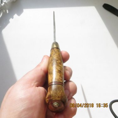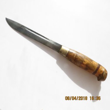 Предложу старенькую финку. Общая длина 257мм. Клинок из углеродки, в сечении ромб: 147мм х 19мм х 3,8мм (по ребру)/3мм (по обуху). Рукоятка - карельская береза, хвостовик клинка - на расклёп. Оковка из латуни с минималистичными ромбо-узорами. Нож крепкий и острый. Ножен нет.