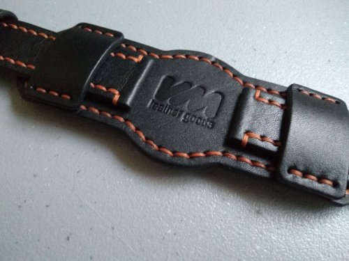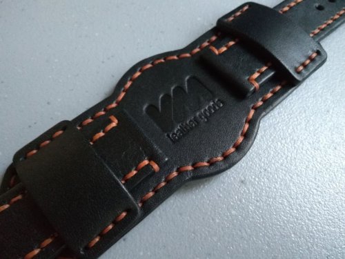 Брутальный ремешок-напульсник для наручных часов, цвет черный. Прошит вощеной нитью кирпично-рыжего цвета вручную. Ременная кожа 3,6-4мм, обработана влаго отталкивающим специальным составом на основе натуральных компонентов.