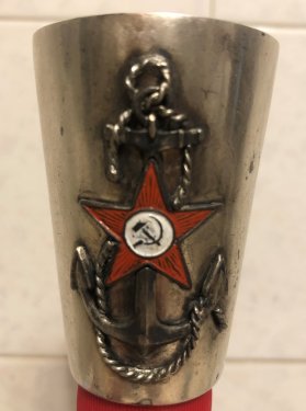 Рюмка серебро 875 пробы, клеймо завода. Высота 6.5 см. диаметр донышка 3 см, по верху 4.5 см. Объем 75 грамм. (достаточно вестимая, треть стакана). Серебряная накладка якорь со звездой. Звезда - эмалевая краска. вес 51 грамм. Подарок герою ВМФ начала 50-х. Небольшие мятины, царапины. Цена 10 000 руб. Лот во Владивостоке. Почта на покупателе.
