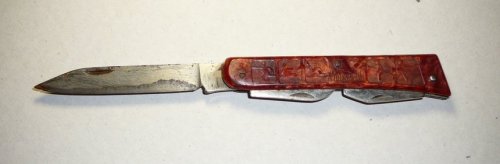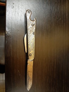 Видел как-то нож с аналогичным рисунком на накладках, но немного другой формы - с симметричной рукояткой - и, помимо двух открывашек, к инструментам была добавлена двузубая вилка.