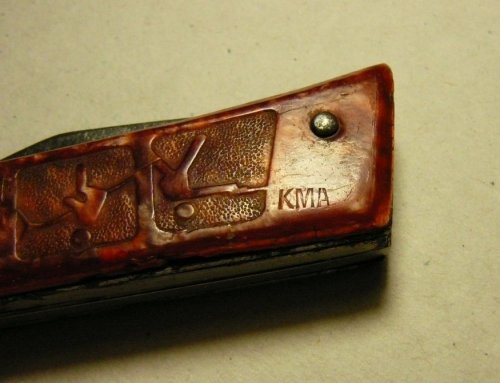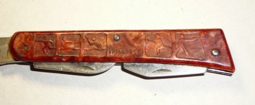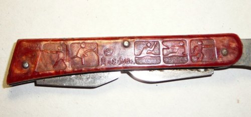 В 1980 г было не до ножиков и не до олимпиады - работал в стройотряде (тянули линии электропередачи в сельской глубинке). Ножик с олимпиады попал ко мне только сейчас. Давыдковский двухрядник с картинками видов спорта на накладках. Кроме обычных олимпийских надписей, логотипа завода и цены, на накладке присутствуют буквы КМА .