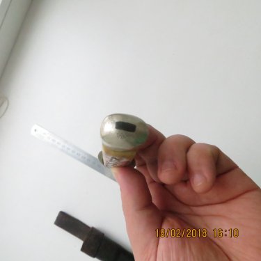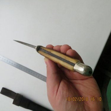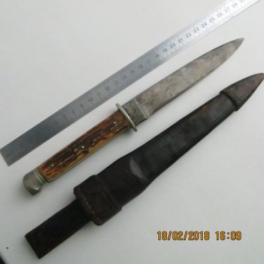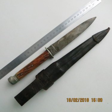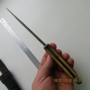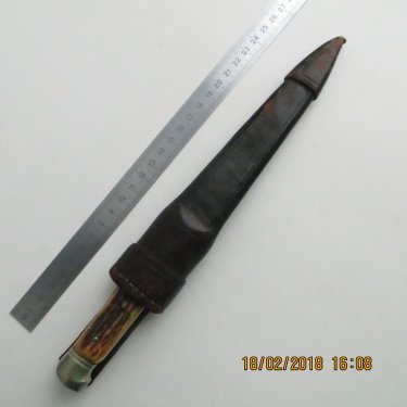 Приехал ко мне намедни очень симпатишный старенький немецкий засапожник. Общая длина 260мм, клинок 146мм х 24мм х 5,7мм. Углеродка люто острая, клейм никаких. Рукоять - рог. О том, что это именно засапожный нож свидетельствует заметное отклонение клинка по оси относительно рукояти влево (на фото отразил) - для удобства ношения за голенищем с учетом анатомии. Ножны кожаные многослойные, без металлических элементов, наверное, в тех же целях.