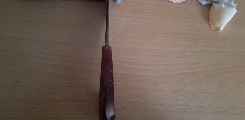 Приехал ко мне намедни очень симпатишный старенький немецкий засапожник. Общая длина 260мм, клинок 146мм х 24мм х 5,7мм. Углеродка люто острая, клейм никаких. Рукоять - рог. О том, что это именно засапожный нож свидетельствует заметное отклонение клинка по оси относительно рукояти влево (на фото отразил) - для удобства ношения за голенищем с учетом анатомии. Ножны кожаные многослойные, без металлических элементов, наверное, в тех же целях.