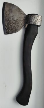 1-й. Высота головы 16,7 см, р к. 14,2 см. Рукоять бук обжиг, длина 38,5 см. Вес головы 770г. Остатки клейма есть но разобрать можно только ММ посередине. Похожи на малый саперный топор РИА, но форма не такая, интересные топорики , зашли даже больше чем малые саперы. Звенят как колокола. 4500+ почта.