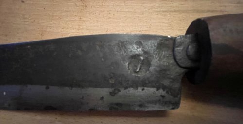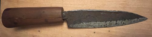 Нож из потеряшек. какой-то из приморских народностей. Клеймо китайскими цифра - 1. Хвостовик удлинен еще в прошлой жизни. Обух со следами насилия, били не жалея. Наклеп с левой голомени удалил, на правой оставил. Общая длина 30 см. клин 19 см. толстый. У рукояти 9 мм. Соответственно жесткий бревном. Тяжелый, вес 360 грамм. Состояние вполне удовлетворительное. Можно свести все раковины, толщина позволяет. Рукоять ремонтная, образец взят с фото 19 века. Что то подобное на фото у Дерсу. Лот во Владивостоке, почта на покупателе. Цена 4000 руб.