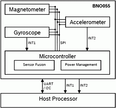 BNO-055 оснащён 32-битным ядром ARM Cortex M0, получает данные с датчиков – трехосевого 14-битного акселерометра, трехосевого 16-битного гироскопа и трехосевого магнитометра.