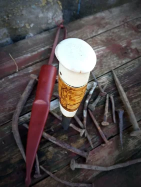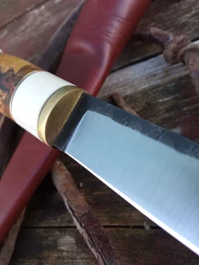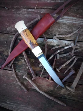 Всём привет! Клинок 122х22х3 мм из австрийского быстрореза Arntz. Рукоять длиной 120 мм из лосиного рога и стабилизированного шпальта бука.