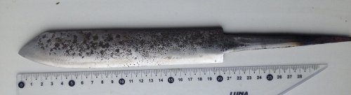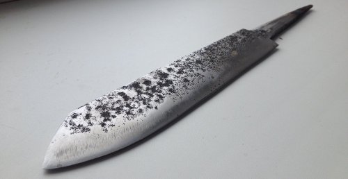интересно мнение товарищей. Досталась от товарища деталь , видимо от какого то старого приспособления для резки-рубки чего то??? фото в исходном состоянии нет. Очистил от ржавчины, грубо от шлифовал, вывел топорные спуски. Габариты клинка: длина 205мм, ширина 38 ближе к носу, 35 у хвостовика, толщина 5,5-5мм, хвостовик 130мм. Сталь достаточно твердая около 58 единиц, ржавучая. Изначально на клинок имел прямоугольную форму, форма хвостовика родная, на конце клинка со стороны обуха было сформировано кольцо-видимо под ось приспособления, клинок сильнее изношен ближе к хвостовику, глубокие каверны.