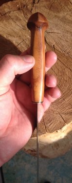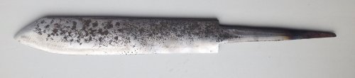 интересно мнение товарищей. Досталась от товарища деталь , видимо от какого то старого приспособления для резки-рубки чего то??? фото в исходном состоянии нет. Очистил от ржавчины, грубо от шлифовал, вывел топорные спуски. Габариты клинка: длина 205мм, ширина 38 ближе к носу, 35 у хвостовика, толщина 5,5-5мм, хвостовик 130мм. Сталь достаточно твердая около 58 единиц, ржавучая. Изначально на клинок имел прямоугольную форму, форма хвостовика родная, на конце клинка со стороны обуха было сформировано кольцо-видимо под ось приспособления, клинок сильнее изношен ближе к хвостовику, глубокие каверны.