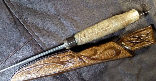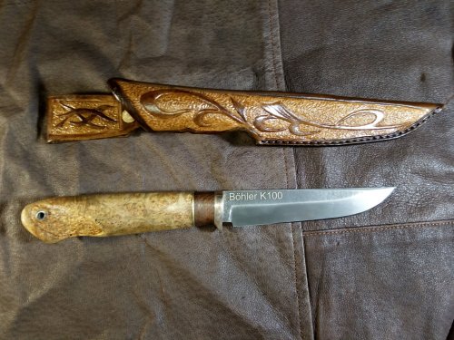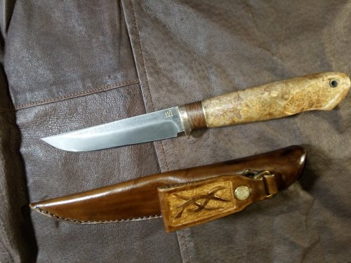 Сталь Bohler K100. Клинок 122х25х4, спуски прямые. Рукоять из не помню, какого капа, вставка лайсвуд, больстер латунь. Общая длина 250 мм. Ножны кожа раст. дубления, тиснение, импортные краски.